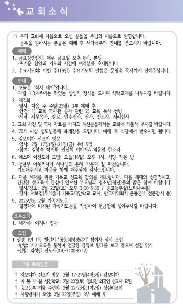 | 상심리교회 2025년 2월 9일 주보 (0) | 2025.02.08 |