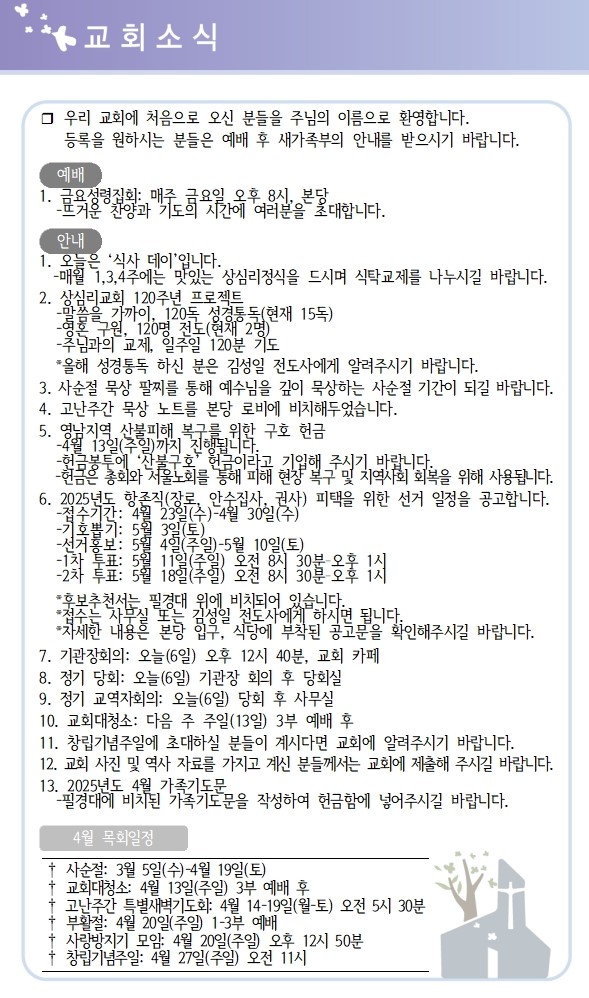상심리교회 2025년 4월 6일 주보