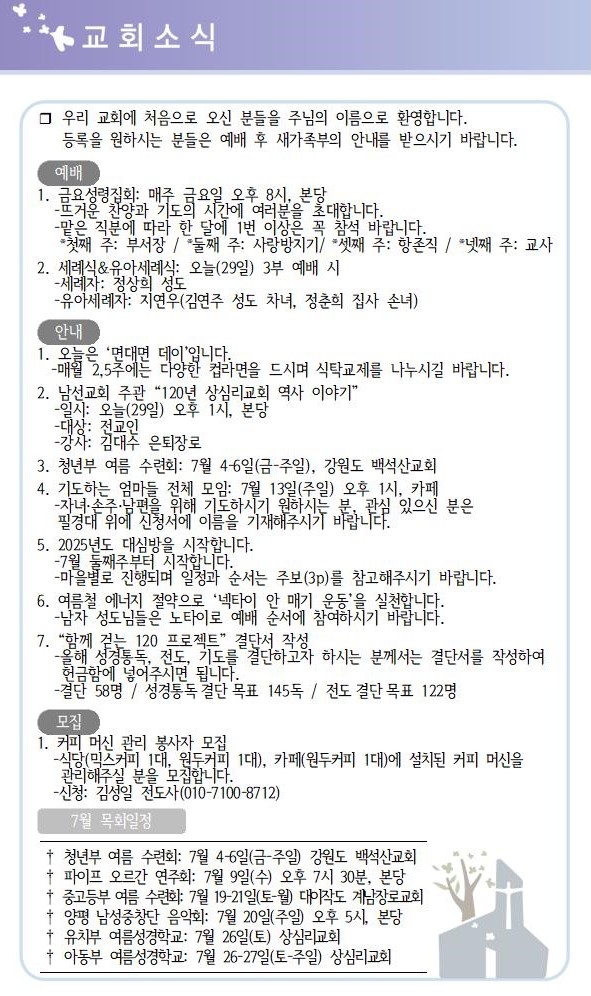 상심리교회 2025년 6월 29일 주보