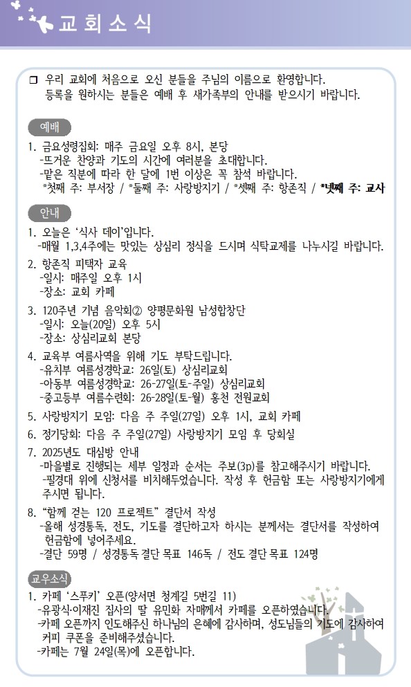 | 상심리교회 2025년 7월 13일 주보 (0) | 2025.07.12 |