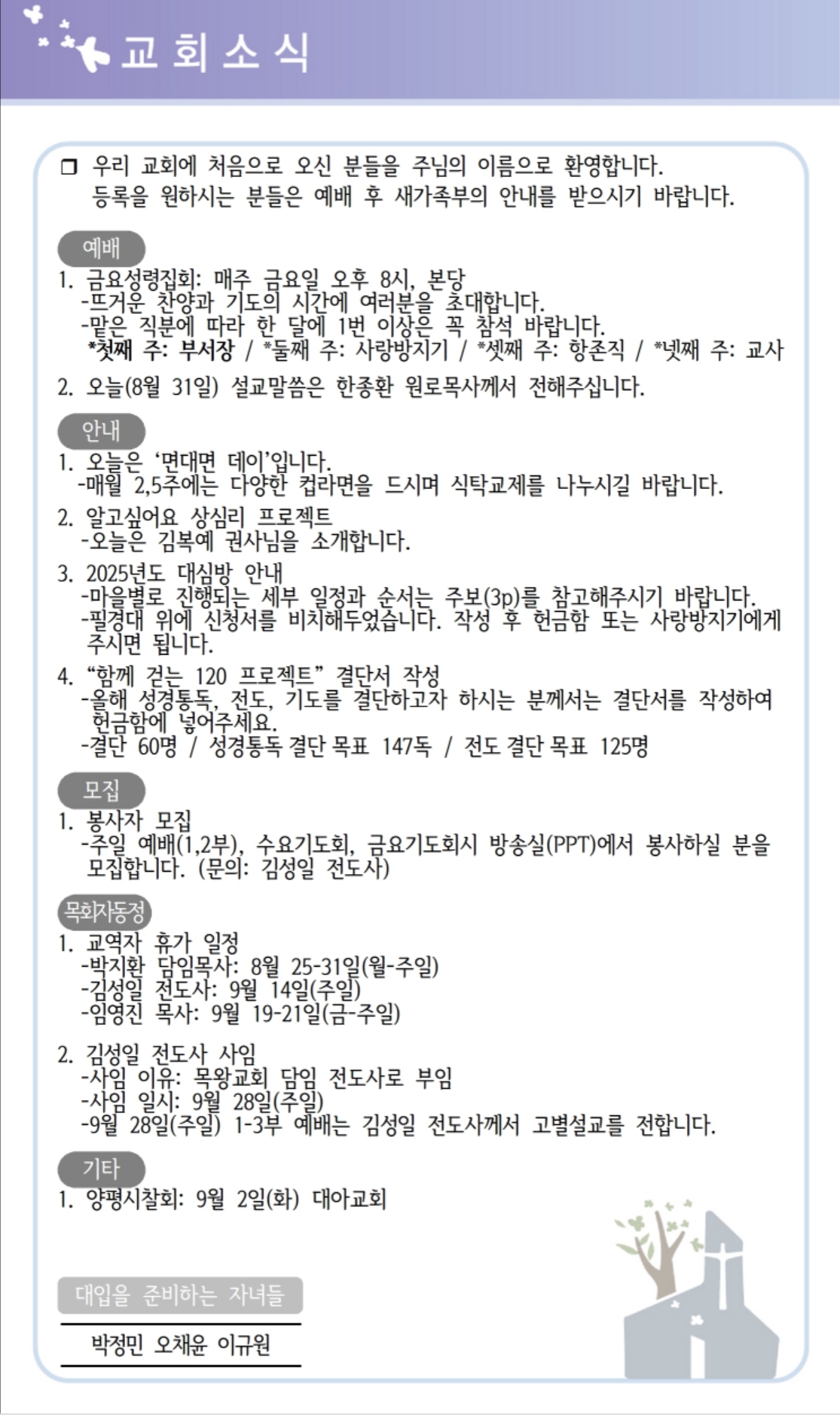 상심리교회 2025년 8월 31일 주보