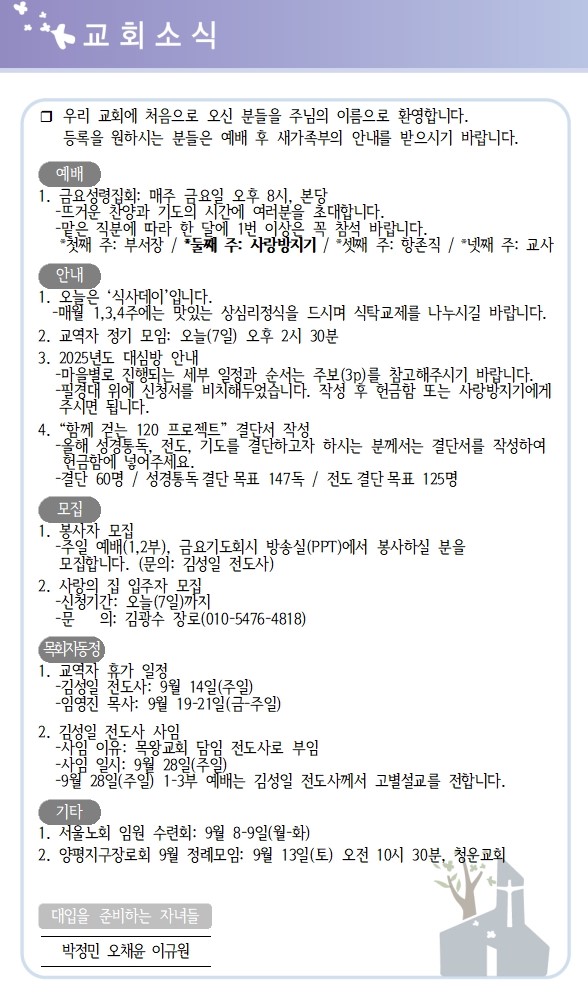 | 상심리교회 2025년 9월 14일 주보 (0) | 2025.09.13 |