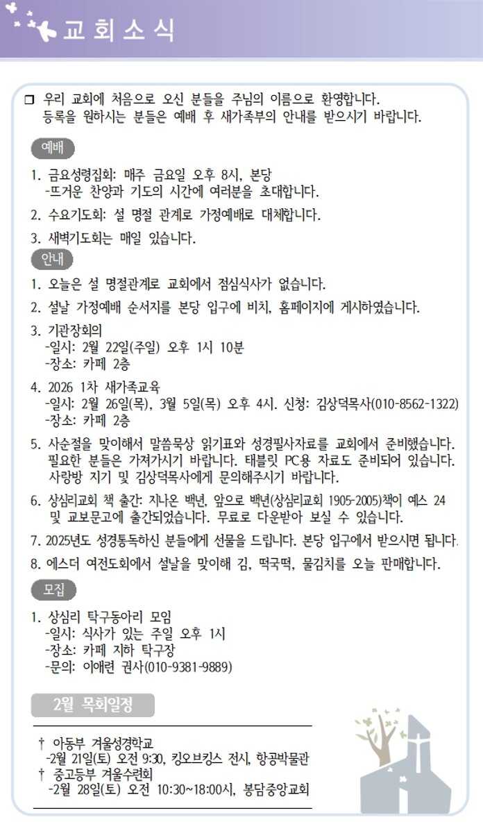상심리교회 2026년 2월15일 주보
