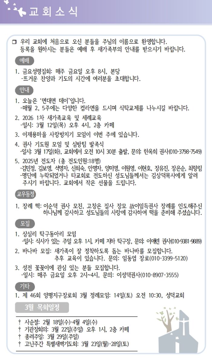 | 상심리교회 2026년 3월1일 주보 (0) | 2026.02.28 |