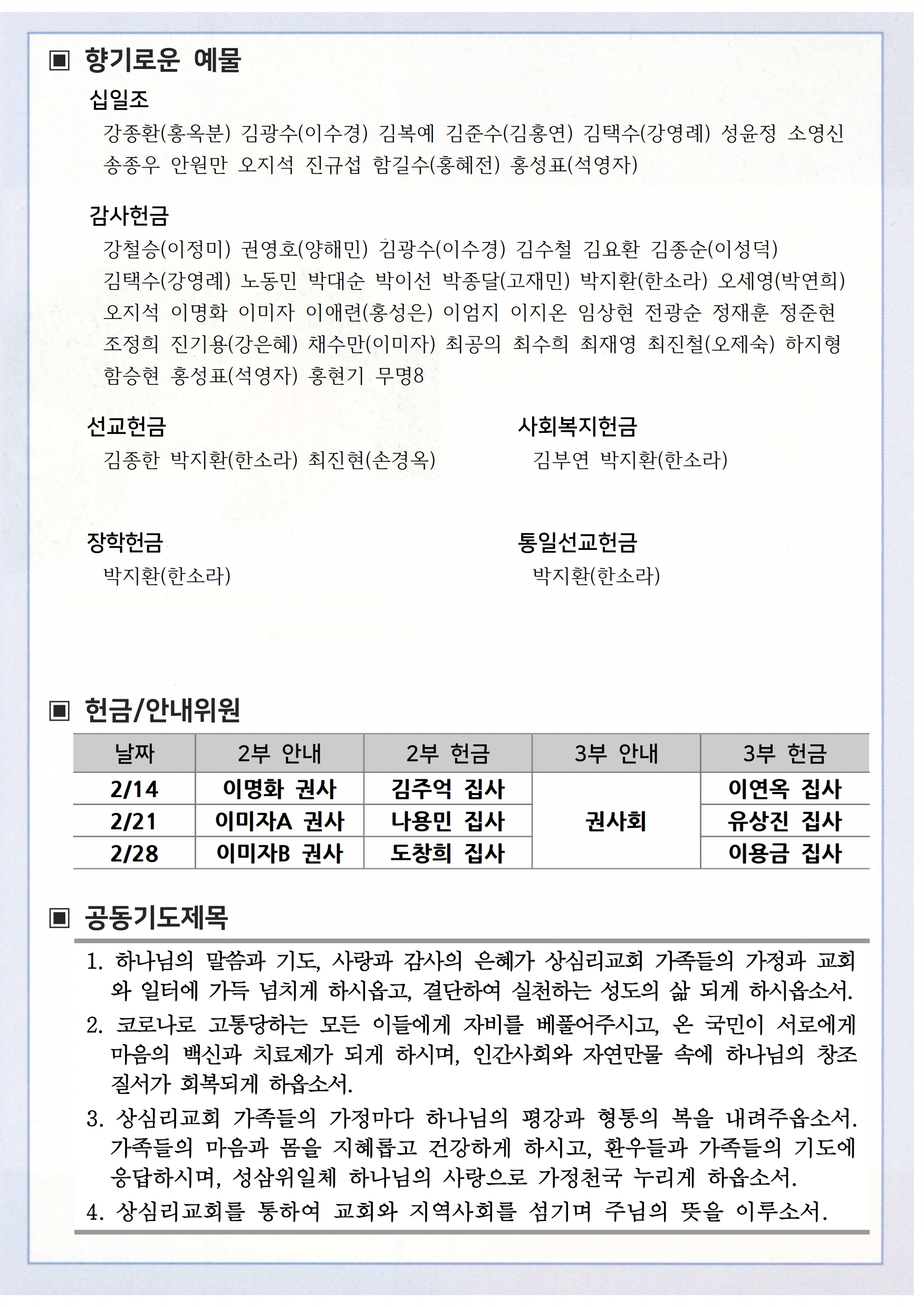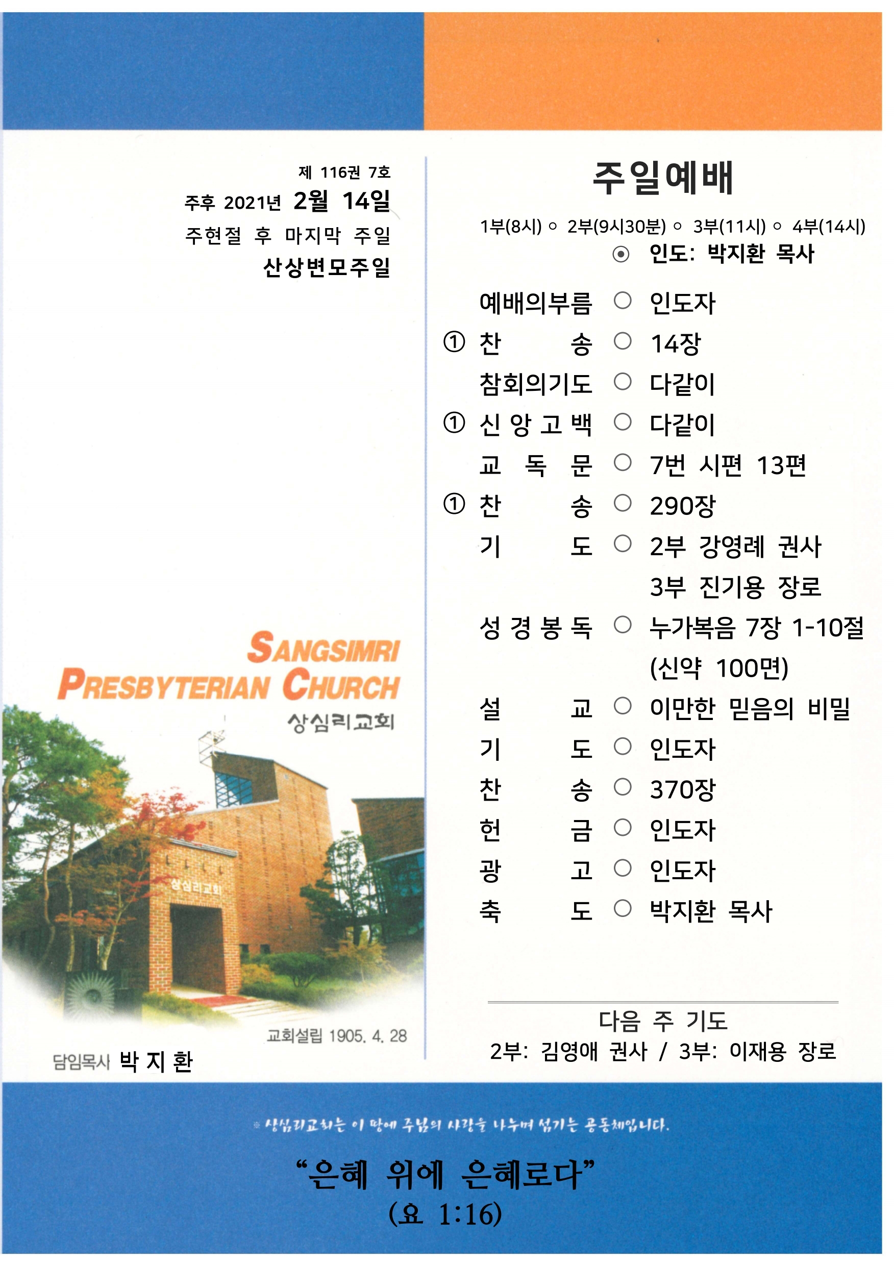 | 상심리교회 2021년 2월 14일 주일예배(2부) 영상 (0) | 2021.02.17 |