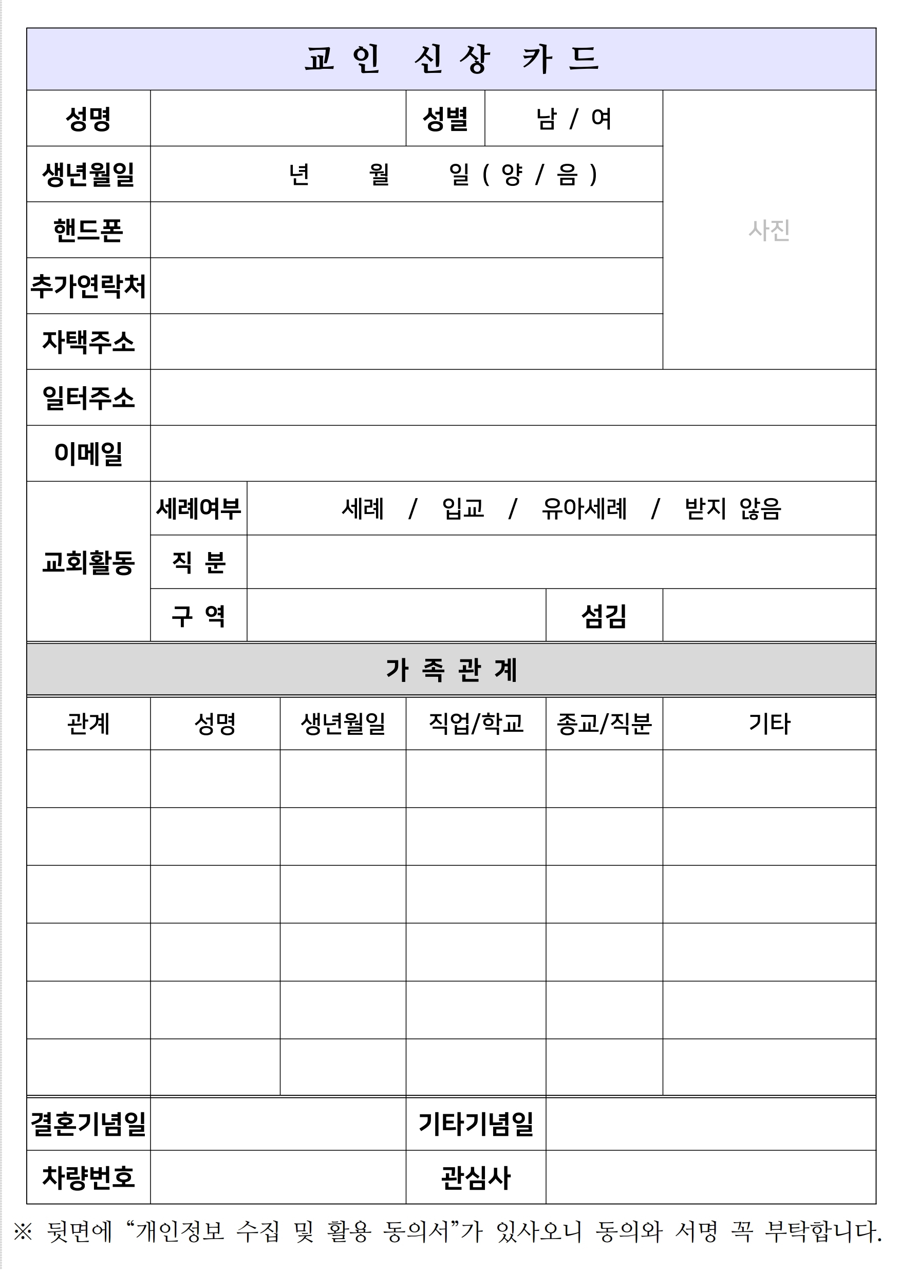 상심리교회 2021년 가족기도문과 교인신상카드(개인정보활용 동의 포함)