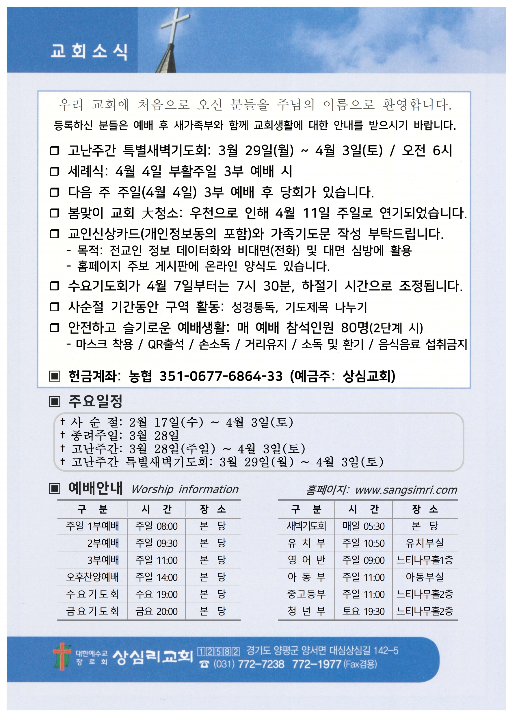 | 상심리교회 2021년 4월 4일 주보 (0) | 2021.04.03 |