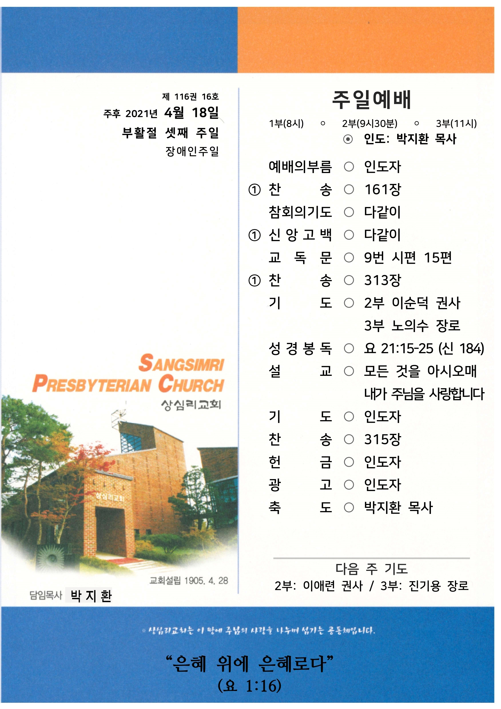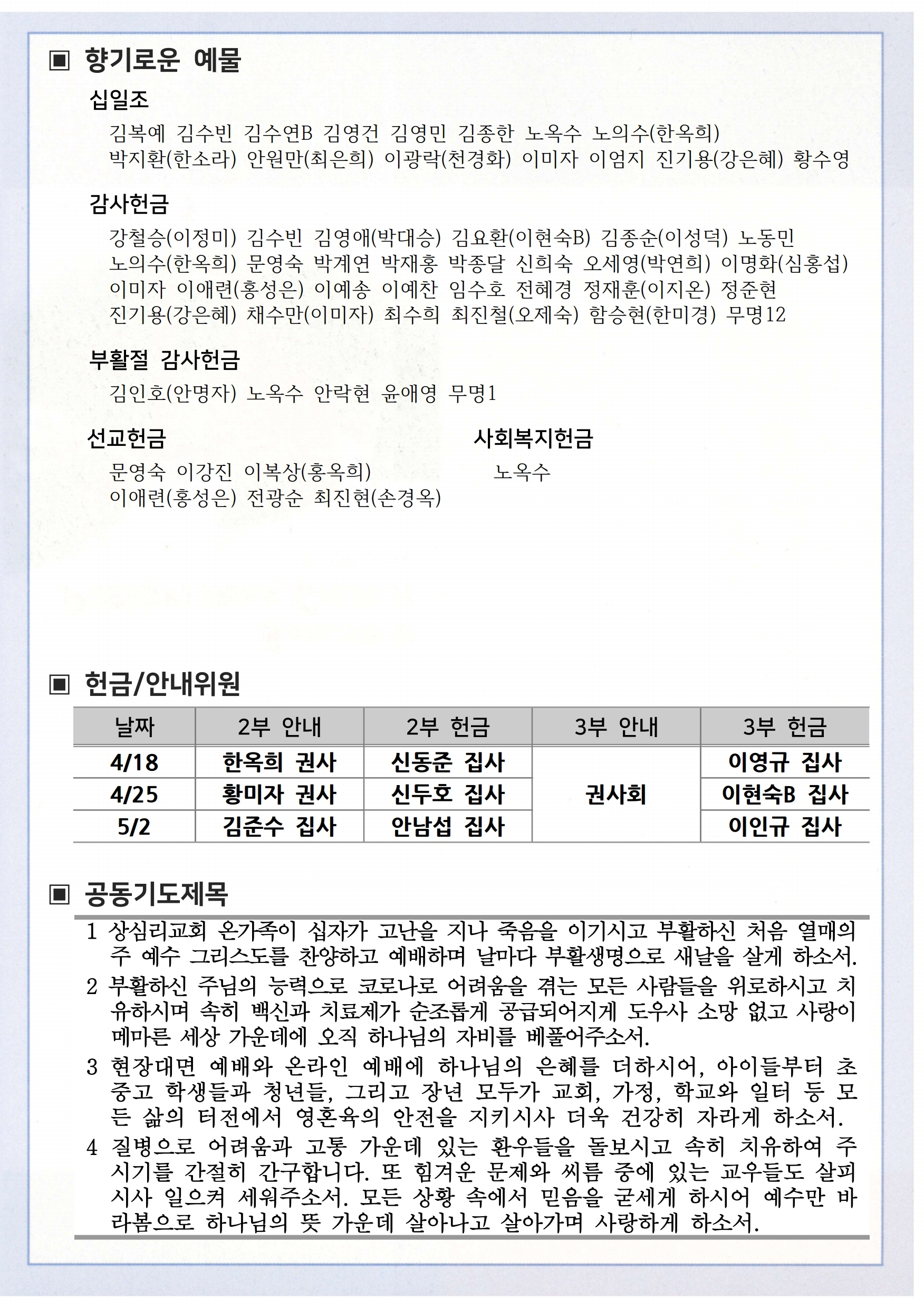 | 상심리교회 2021년 4월 25일 주보 (0) | 2021.04.24 |