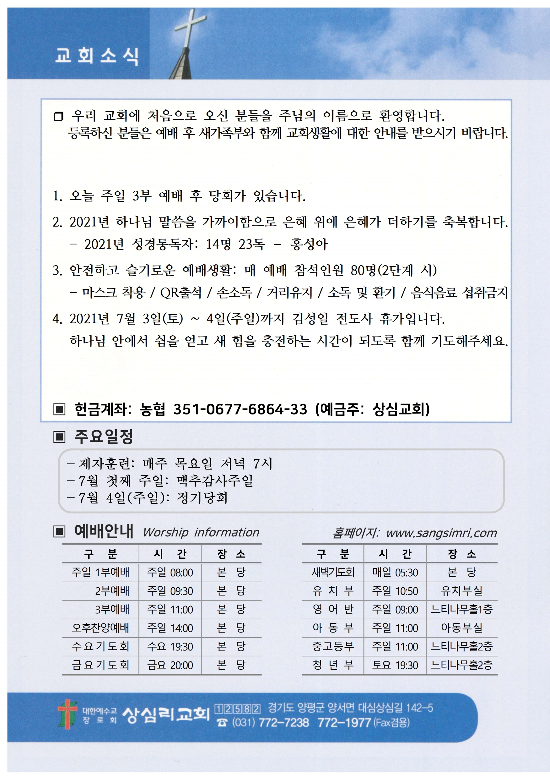 | 상심리교회 2021년 6월 20일 주보 (0) | 2021.06.19 |