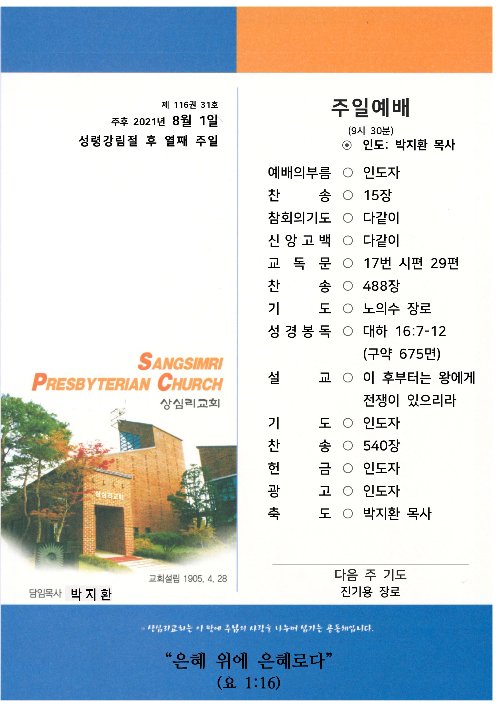 | 상심리교회 2021년 7월 18일 주보 (0) | 2021.07.17 |