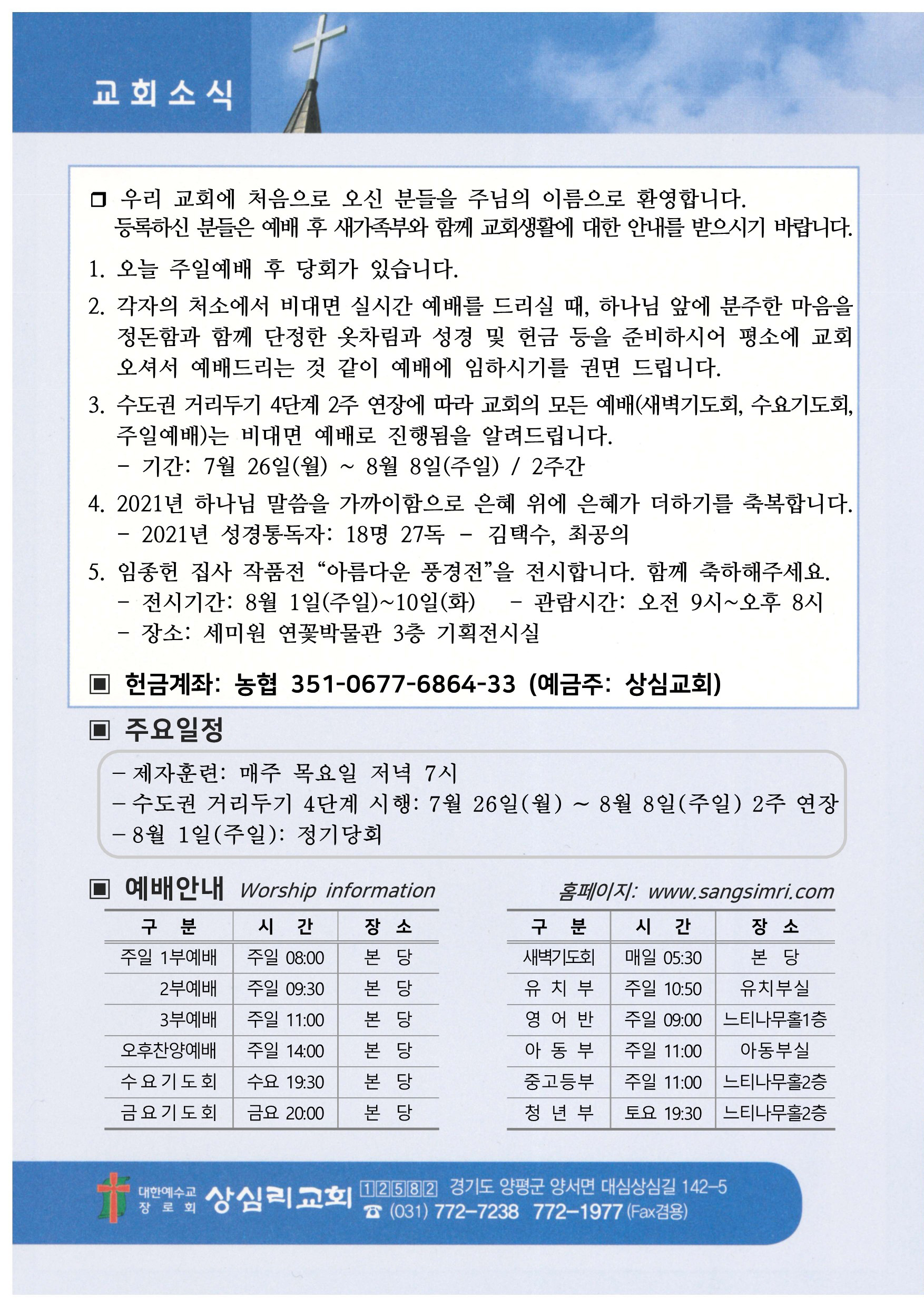| 상심리교회 2021년 7월 25일 주보 (0) | 2021.07.24 |