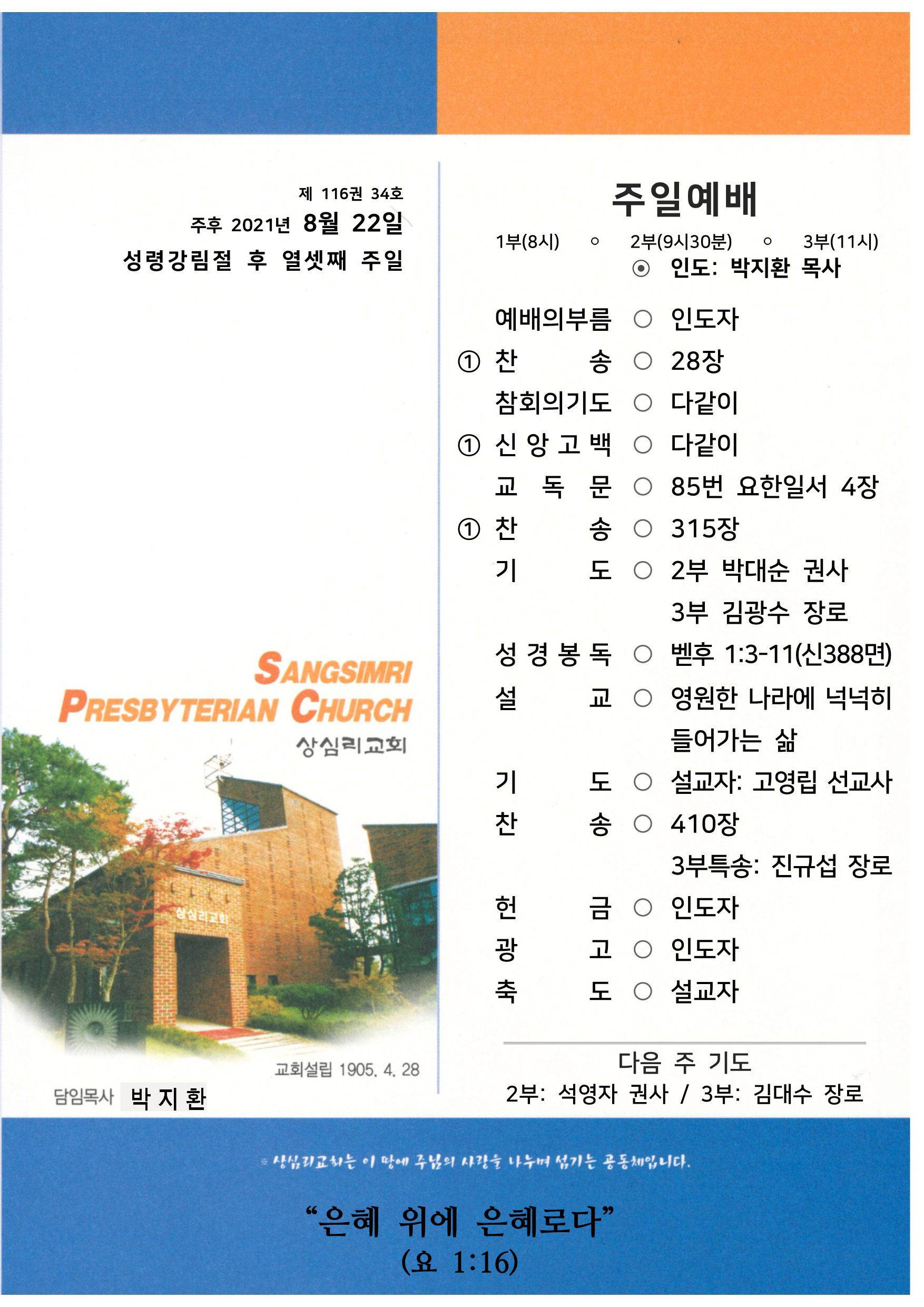 상심리교회 2021년 8월 22일 주보