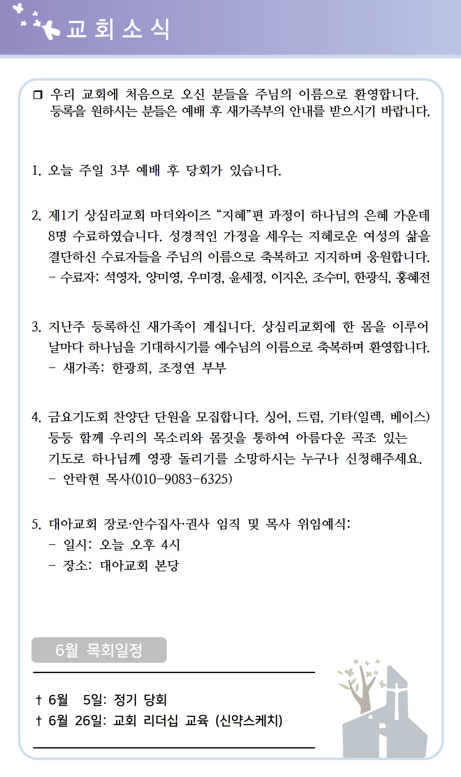 | 상심리교회 2022년 6월 12일 주보 - 삼위일체주일 (0) | 2022.06.11 |