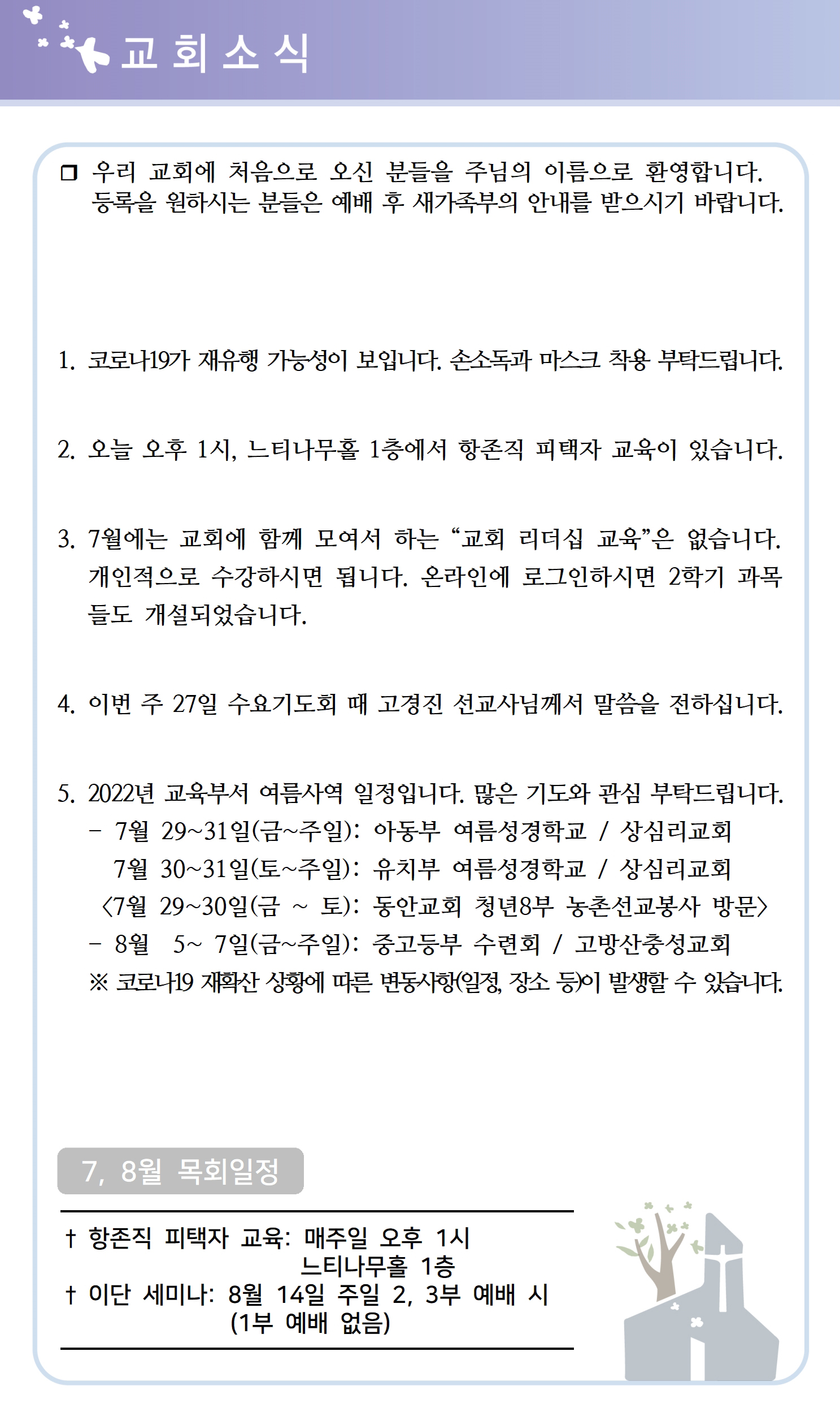 | 상심리교회 2022년 7월 3일 주보 (0) | 2022.07.02 |