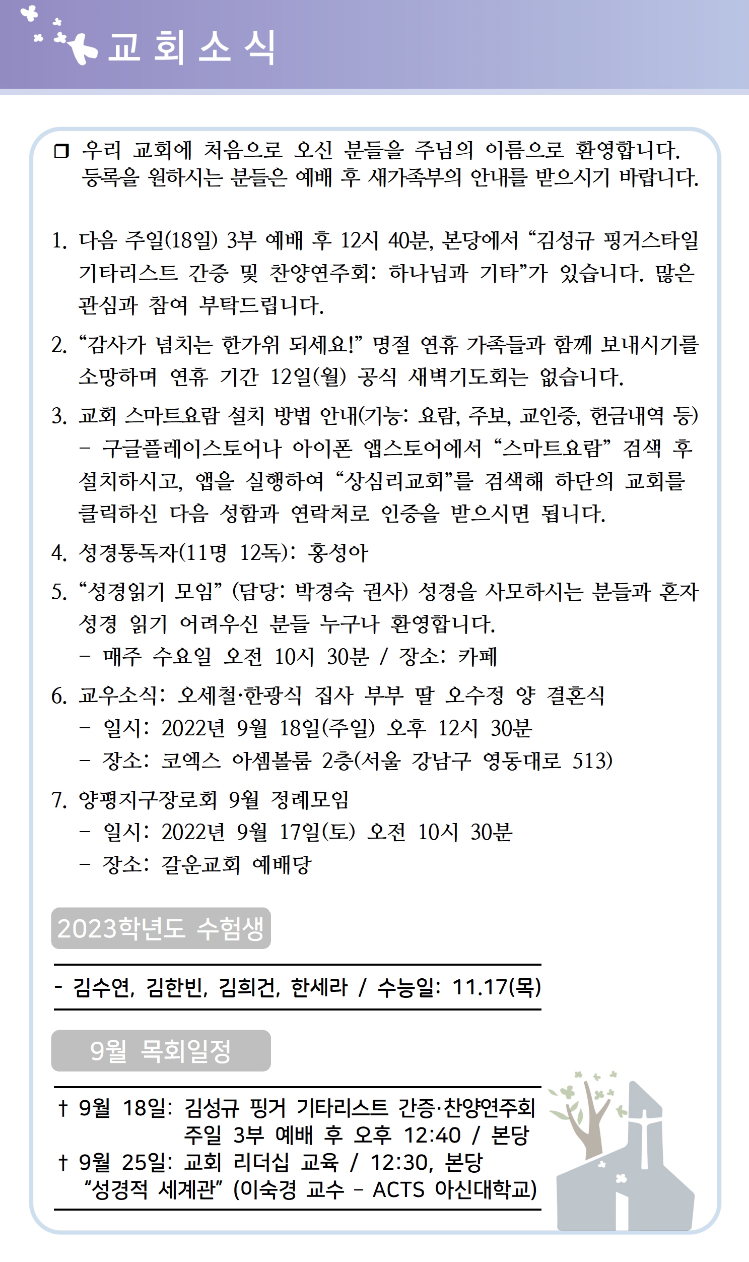 | 상심리교회 2022년 9월 18일 주보 (0) | 2022.09.17 |