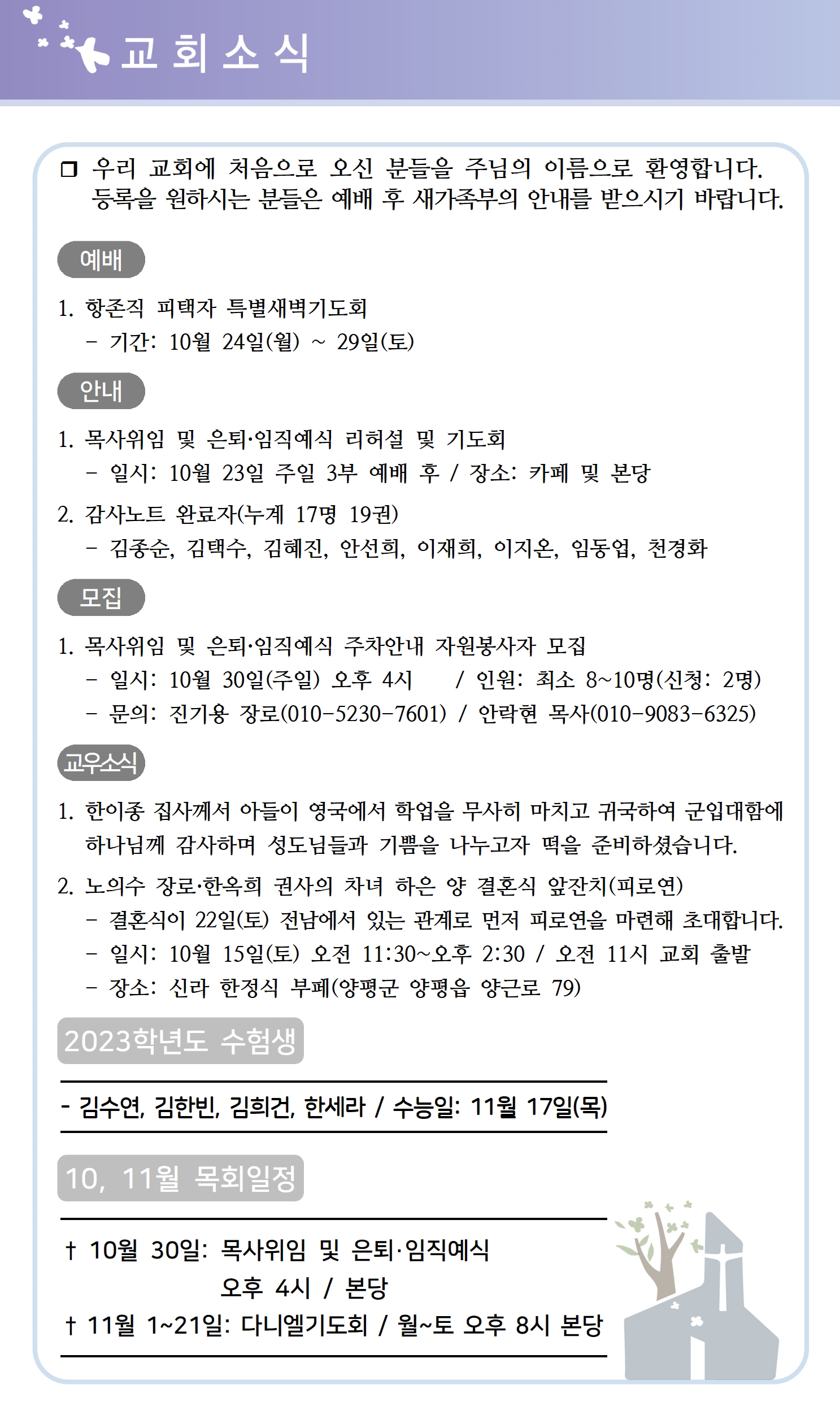 | 상심리교회 2022년 10월 23일 주보 (0) | 2022.10.22 |