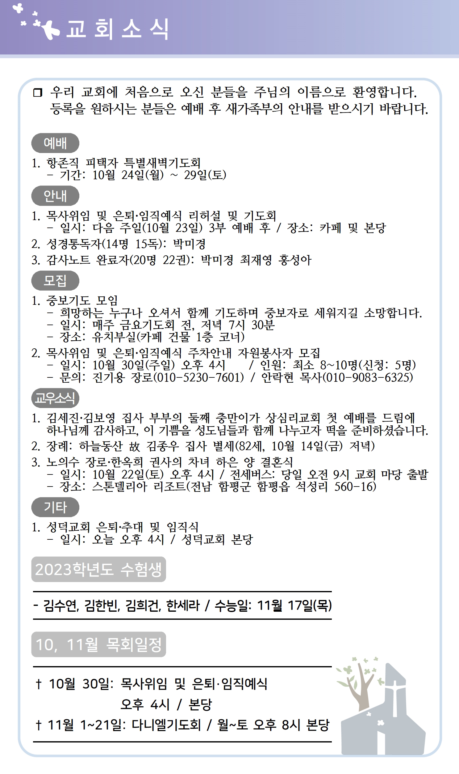 | 상심리교회 2022년 10월 9일 주보 (0) | 2022.10.08 |