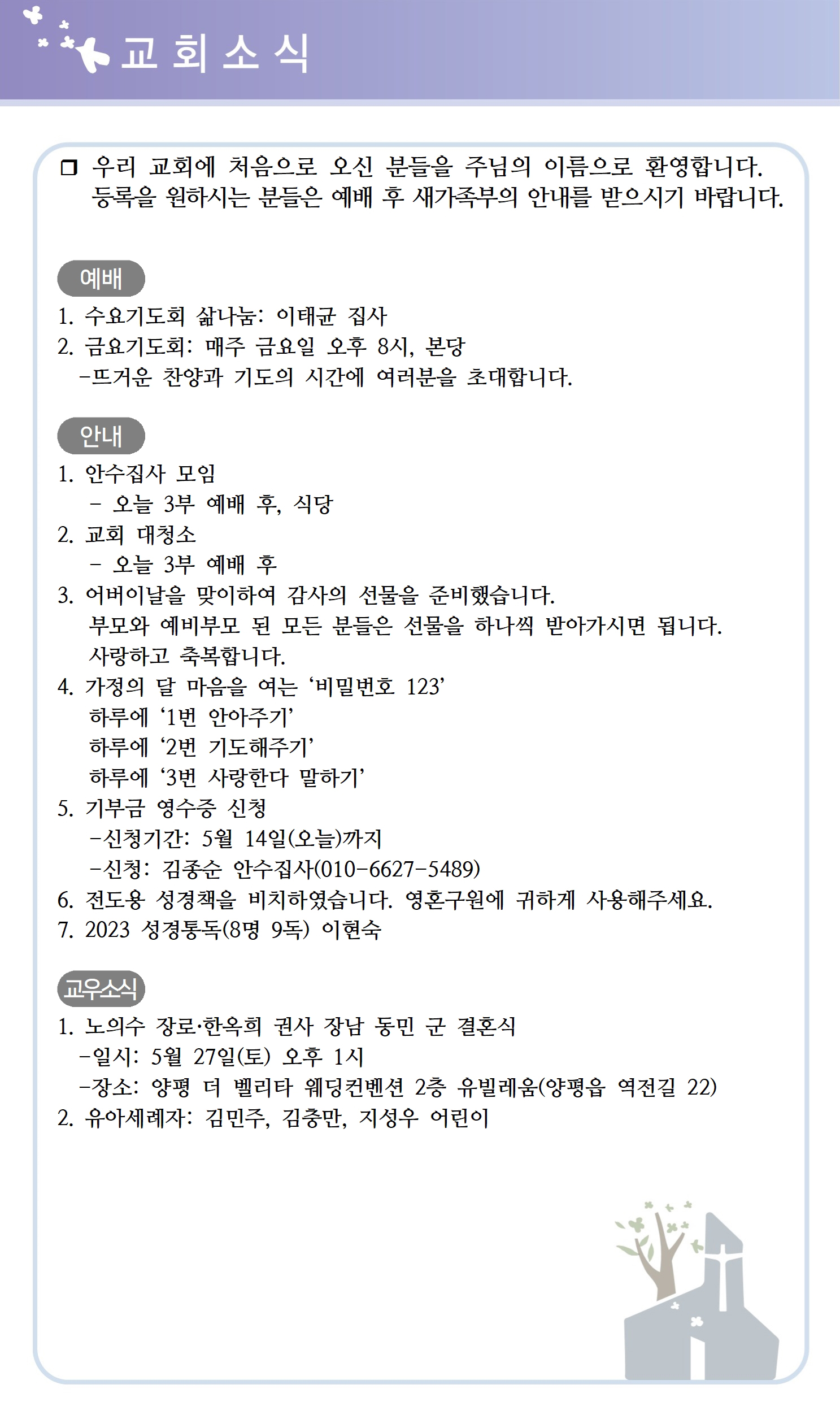 | 상심리교회 2023년 5월 7일 주보 (0) | 2023.05.06 |