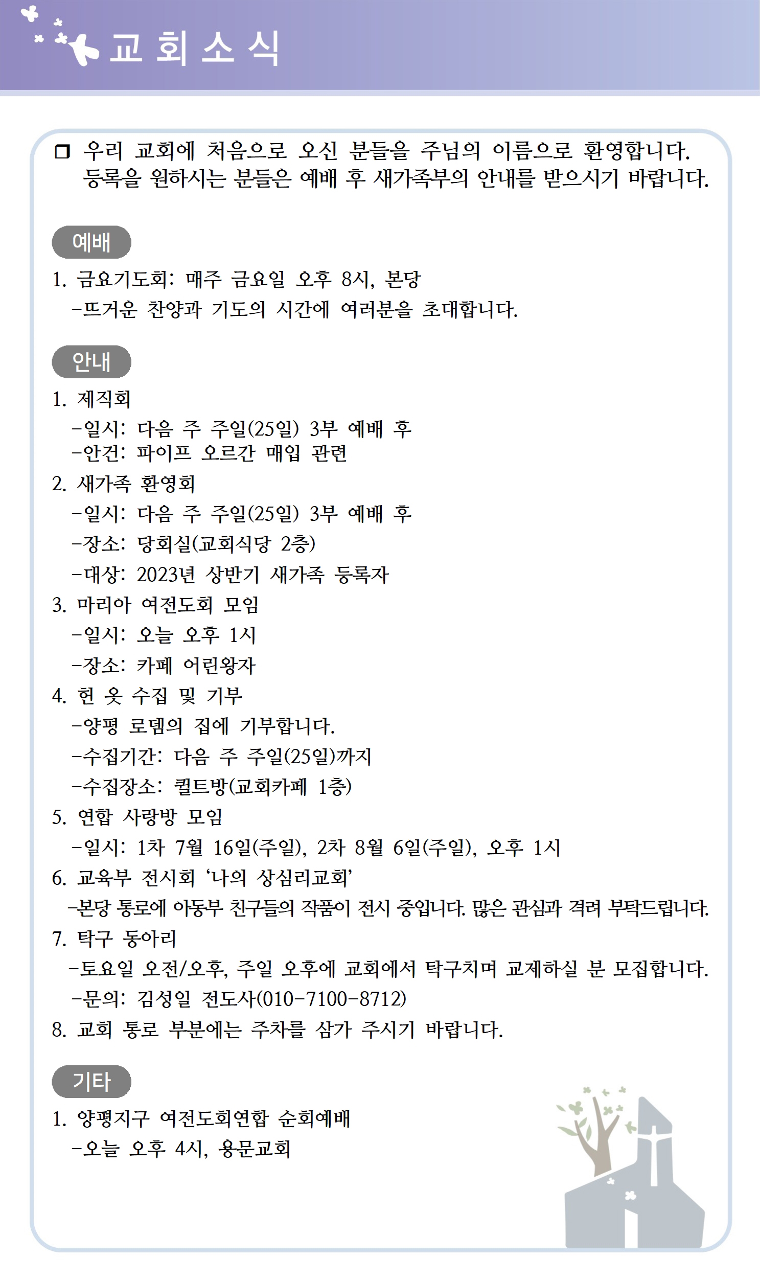 | 상심리교회 2023년 7월 2일 주보 (0) | 2023.07.01 |