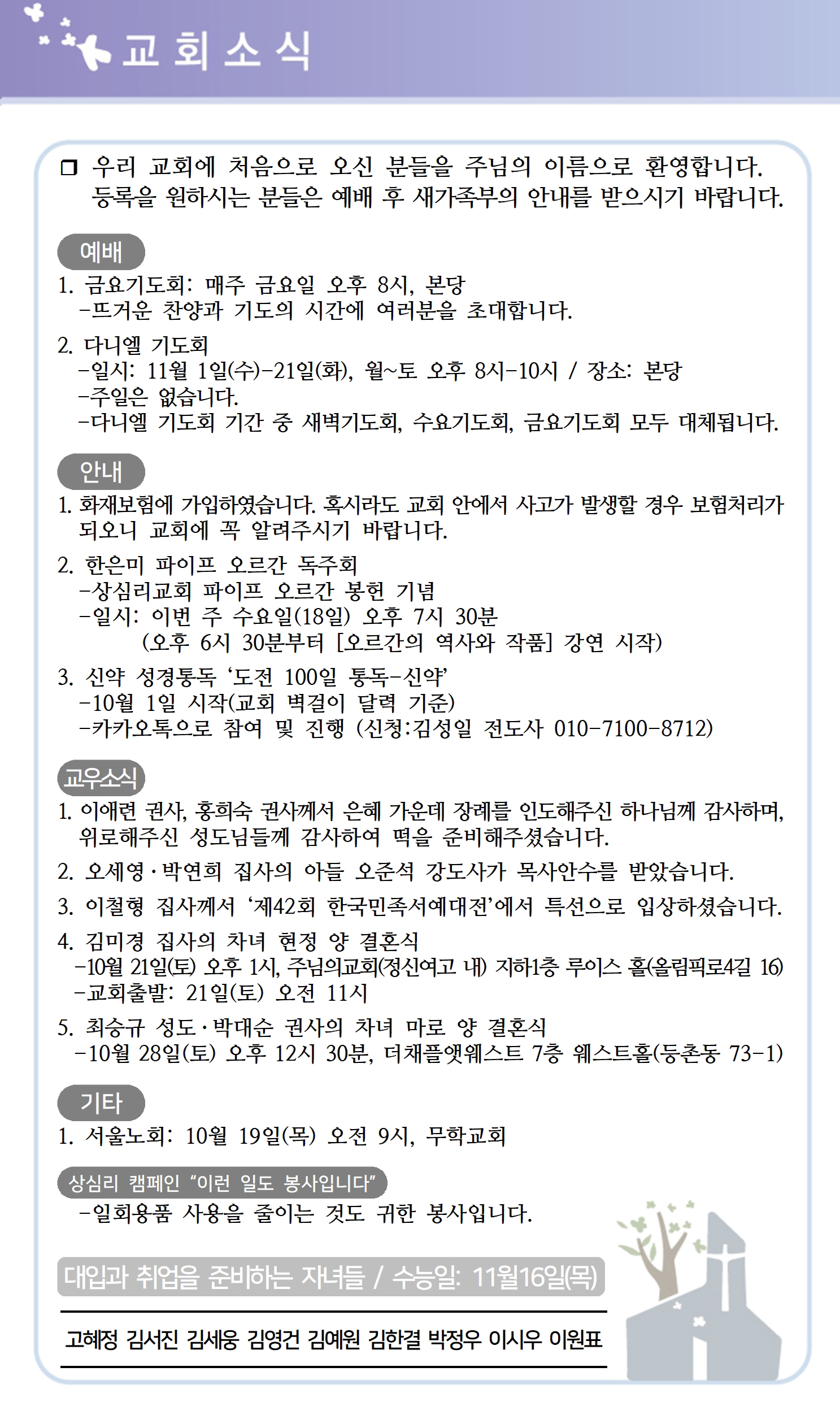 상심리교회 2023년 10월 15일 주보