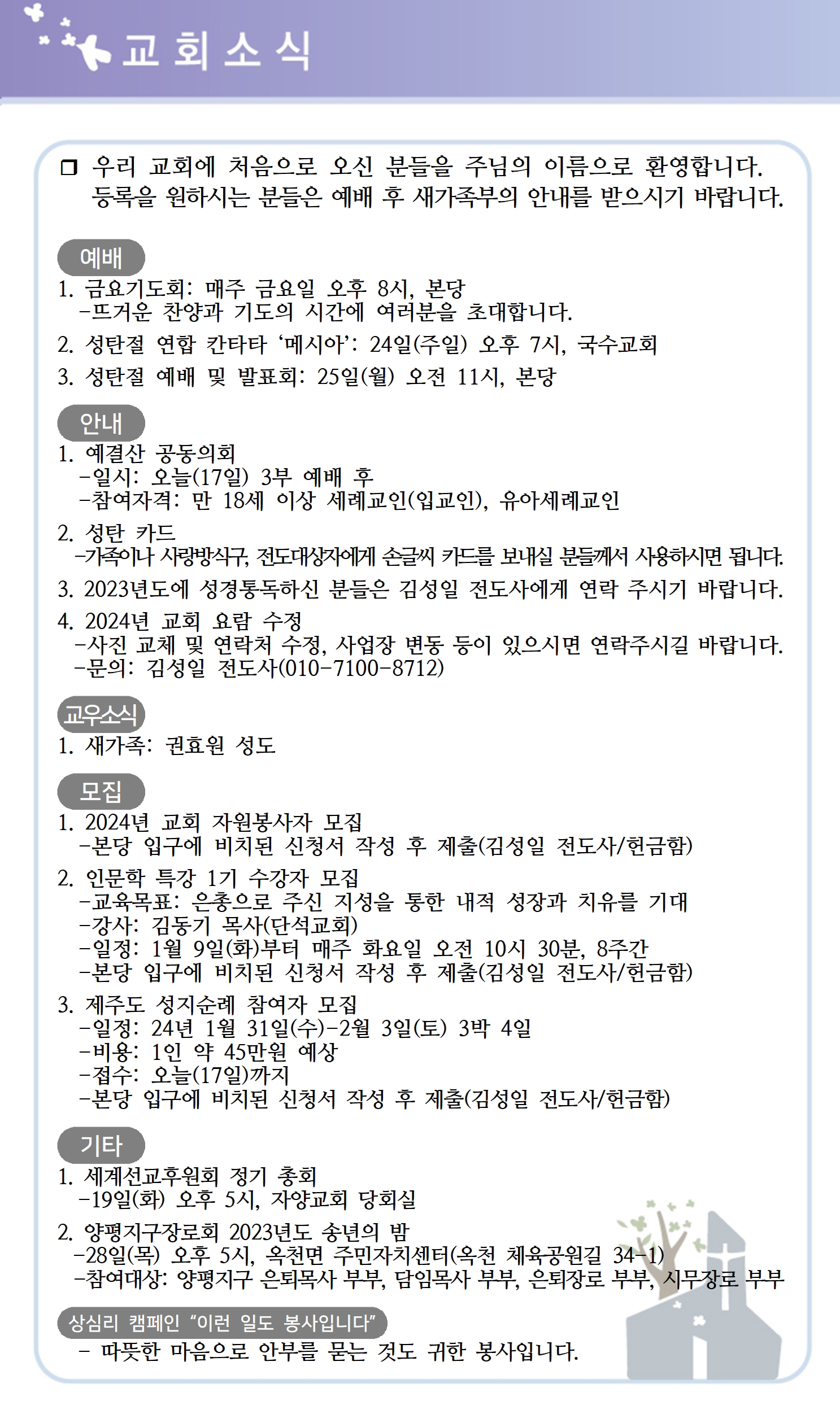 | 상심리교회 2023년 12월 3일 주보 (0) | 2023.12.02 |