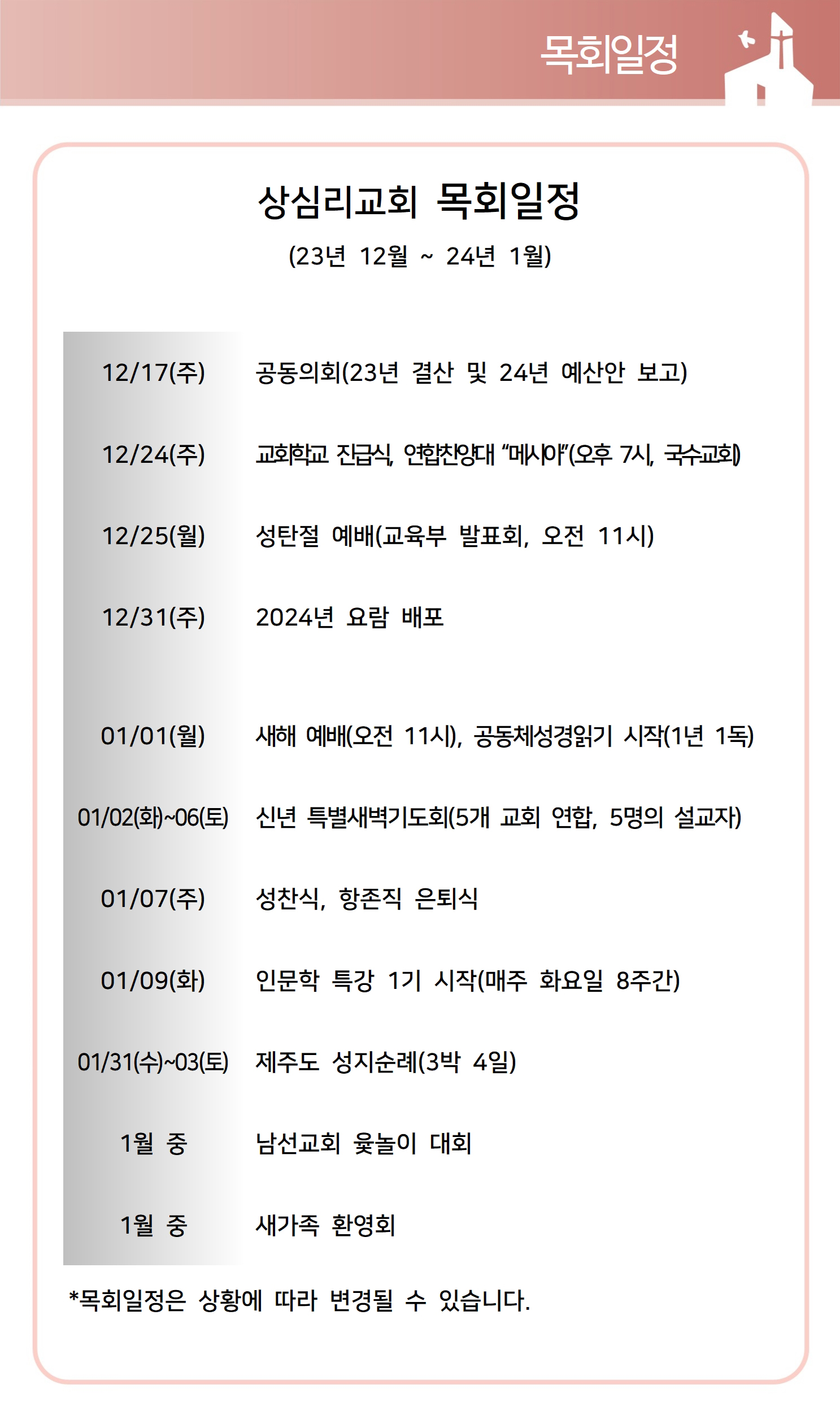 | 상심리교회 2023년 12월 31일 주보 (0) | 2023.12.30 |