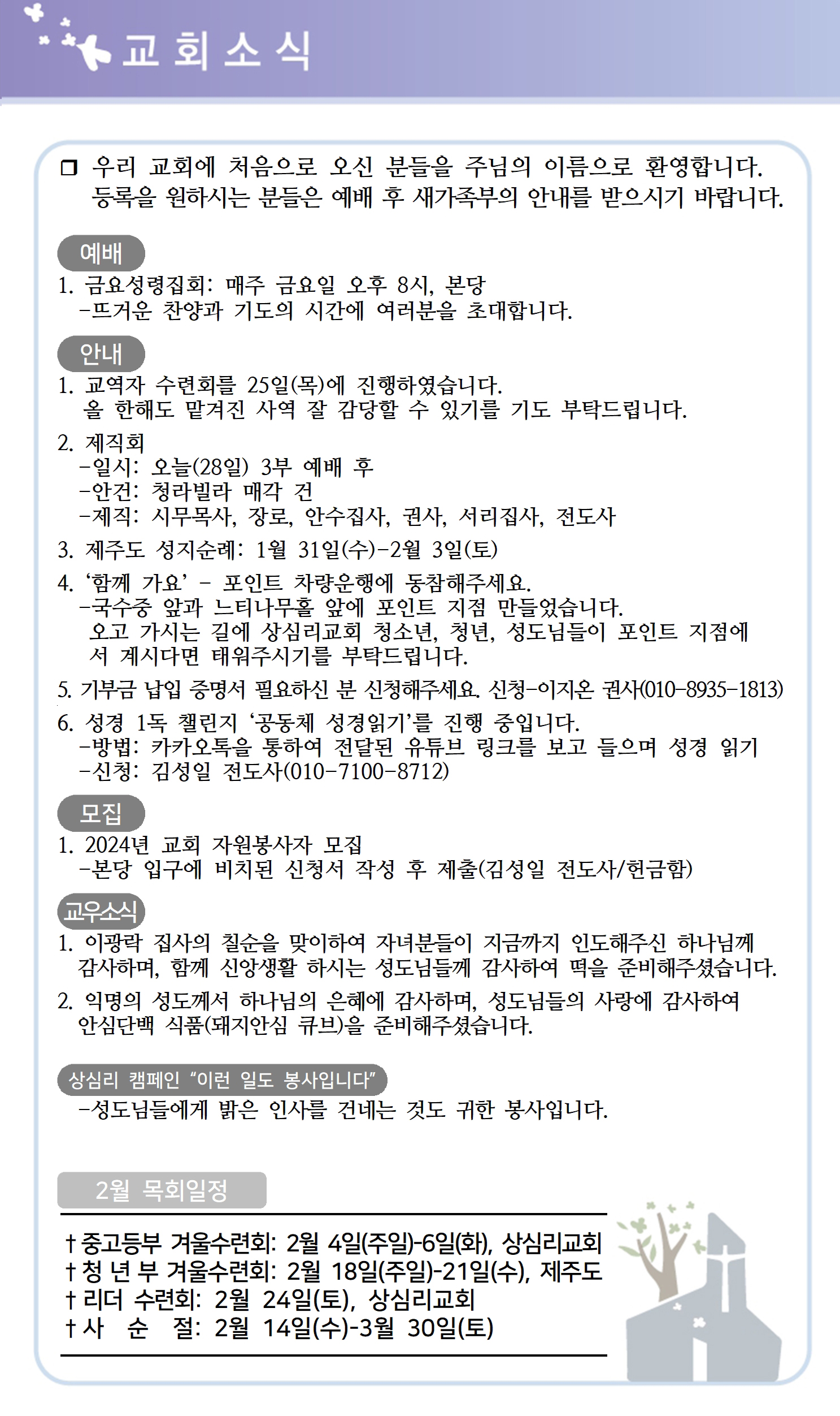 | 상심리교회 2024년 2월 4일 주보 (0) | 2024.02.03 |