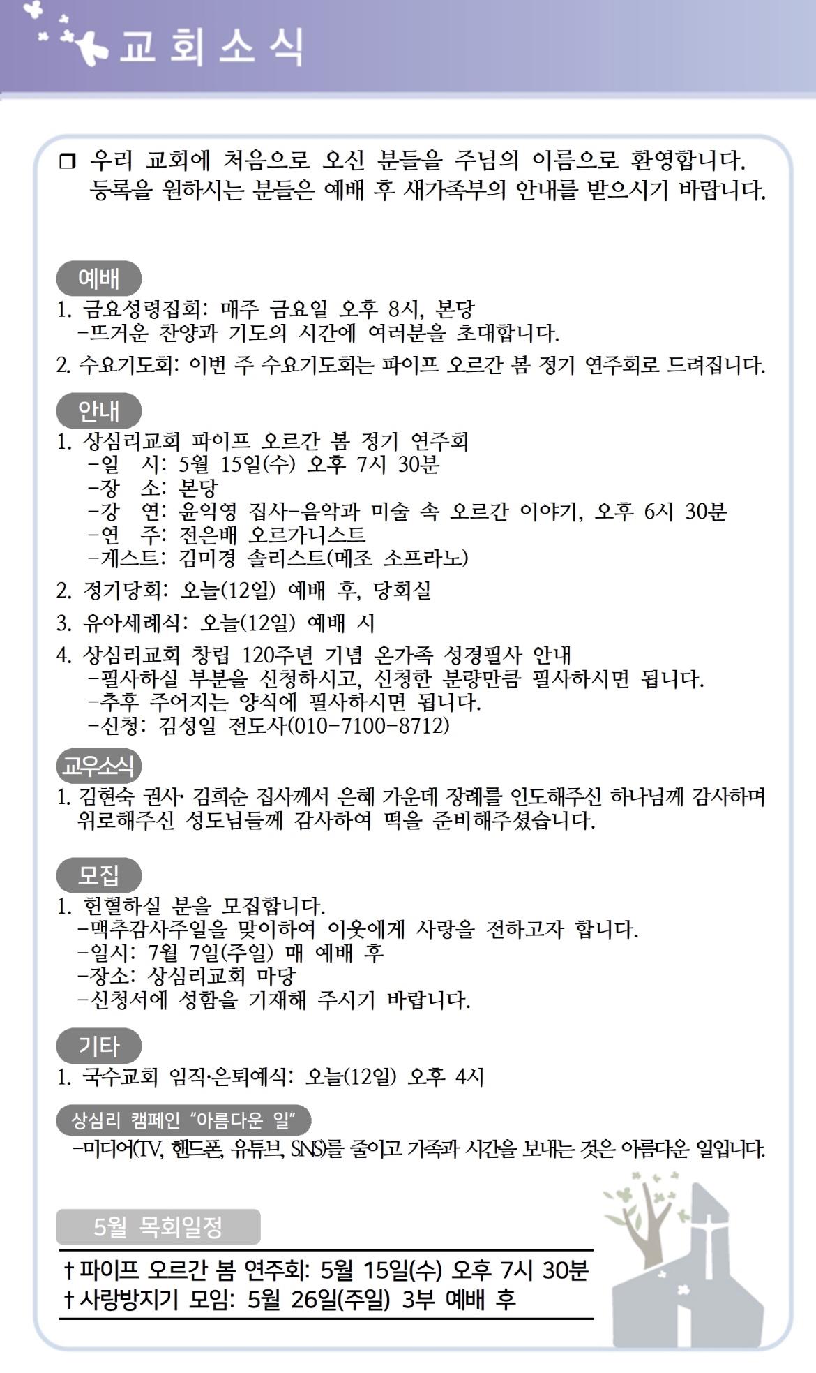 | 상심리교회 2024년 5월 19일 주보 (0) | 2024.05.18 |