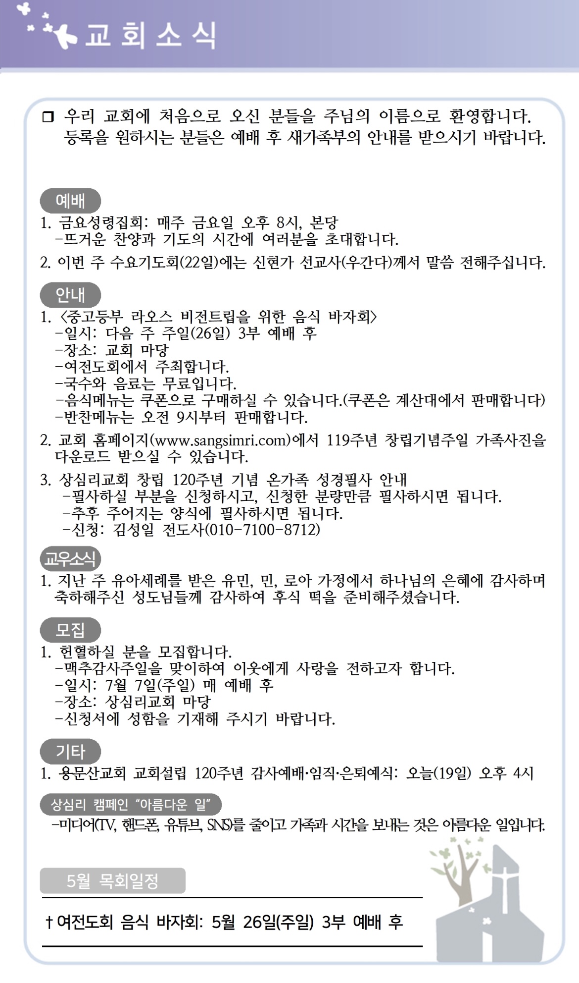 | 상심리교회 2024년 5월 26일 주보 (0) | 2024.05.25 |