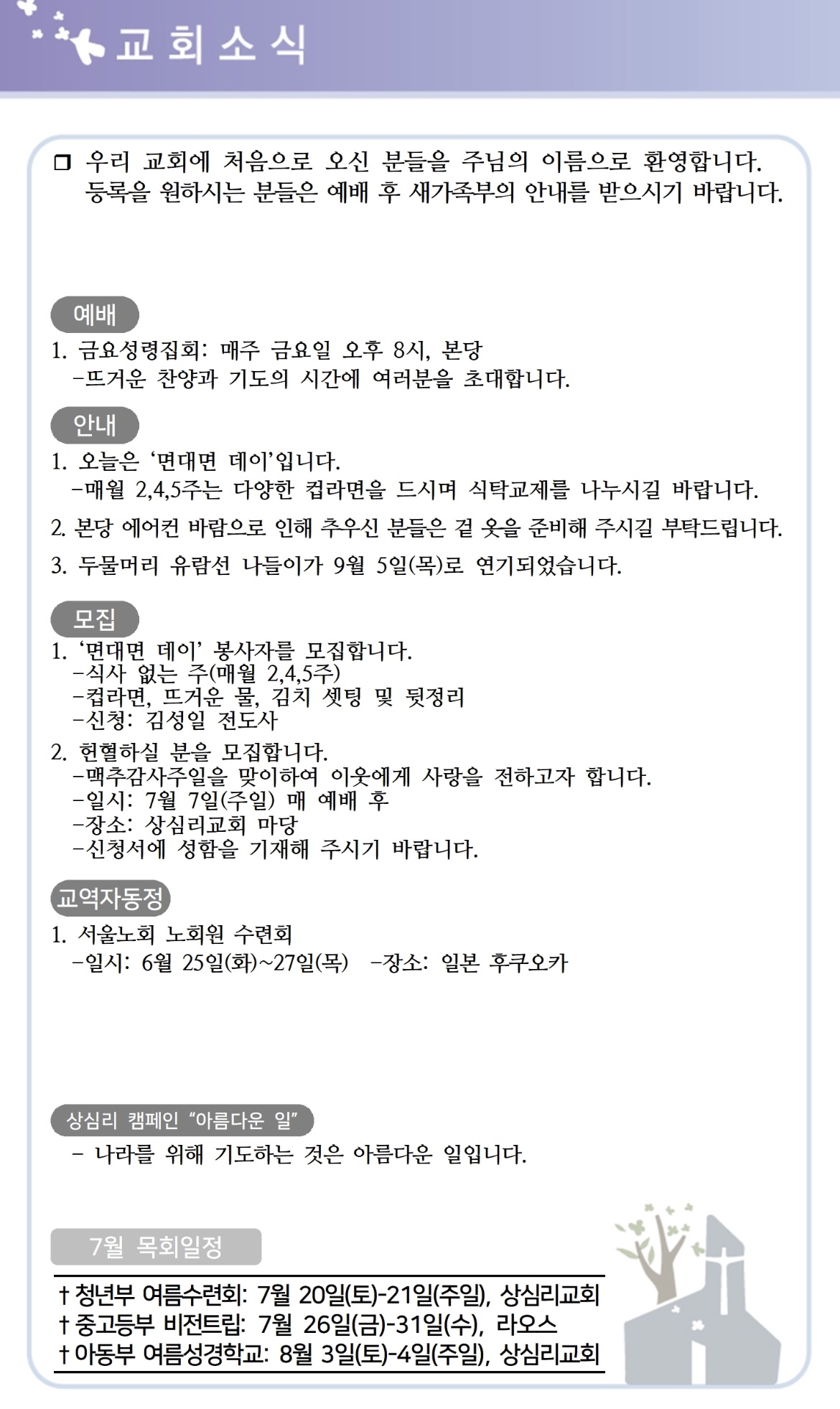 | 상심리교회 2024년 7월 7일 주보 (0) | 2024.07.06 |