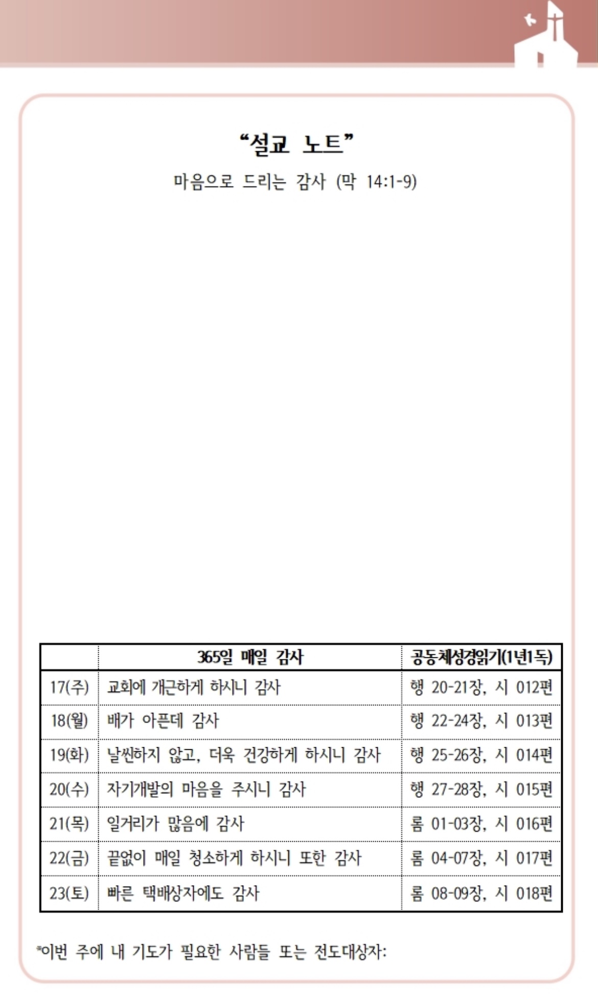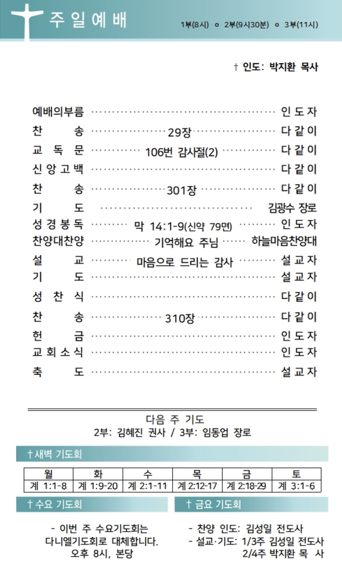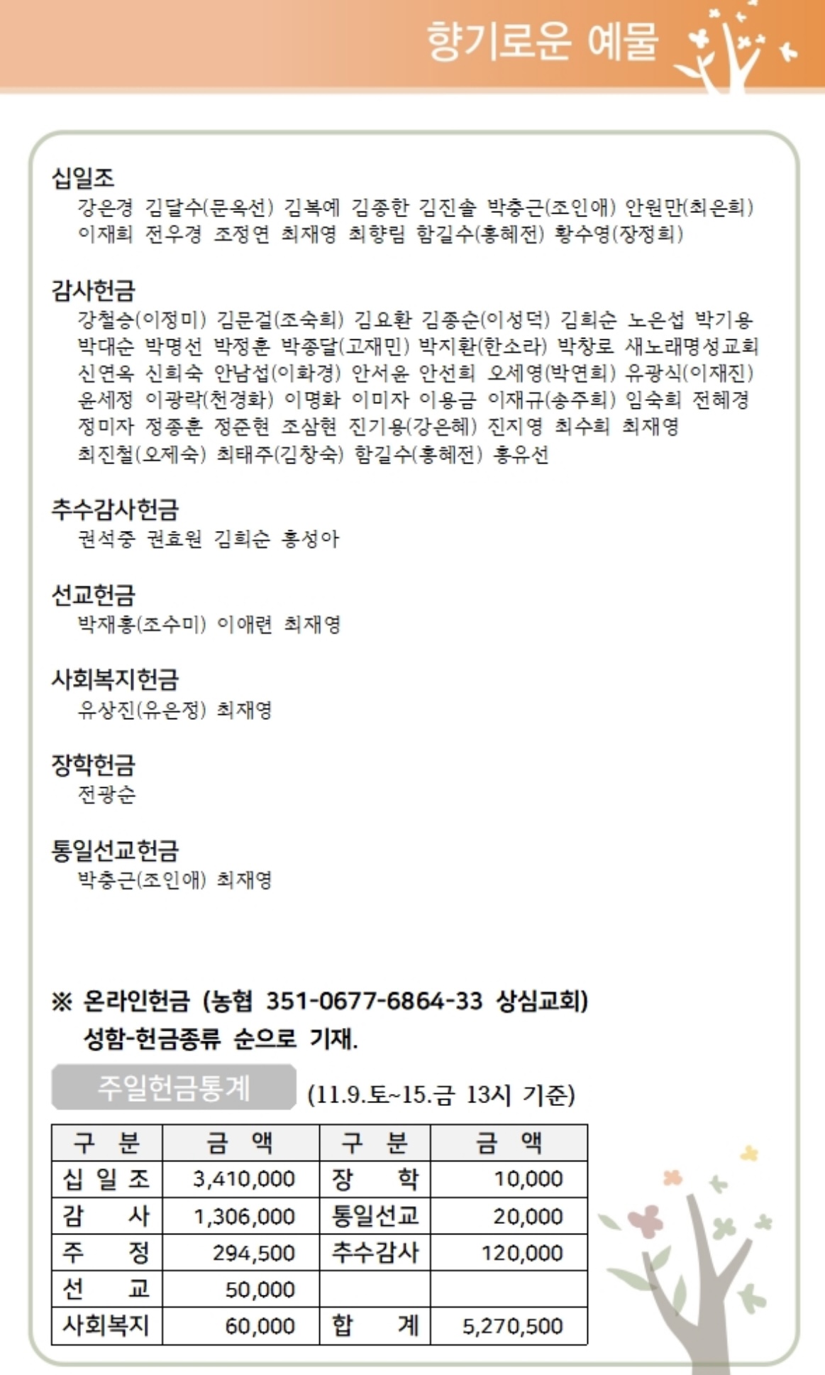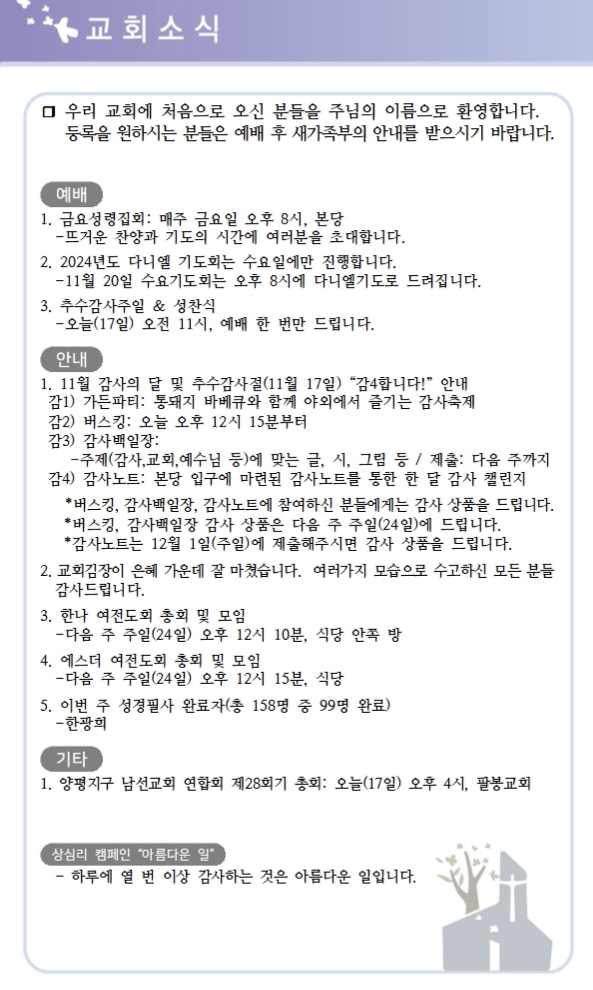 상심리교회 2024년 11월 17일 주보(추수감사주일)