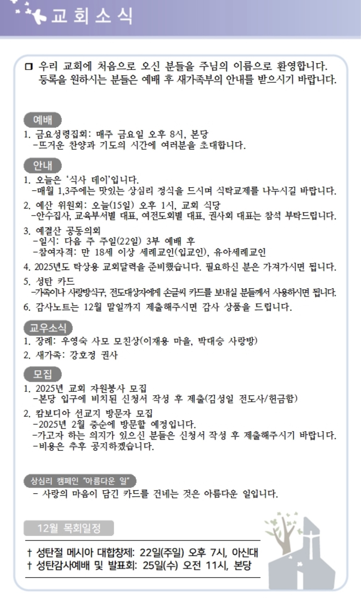 상심리교회 2024년 12월 15일 주보