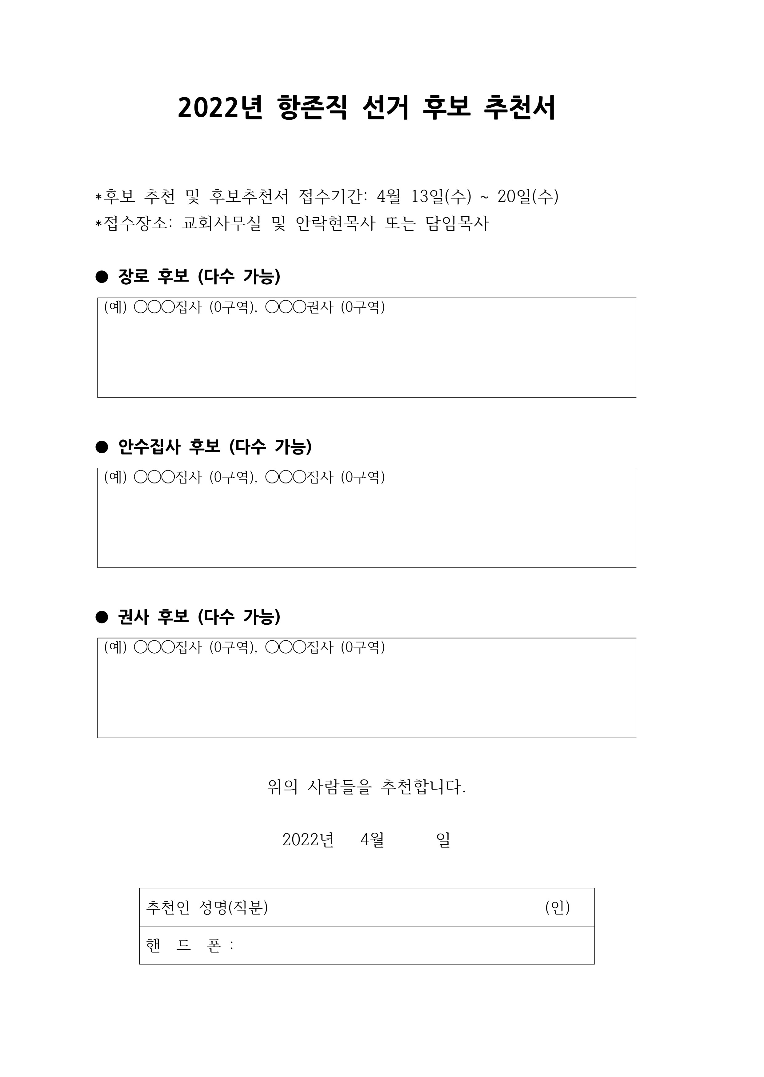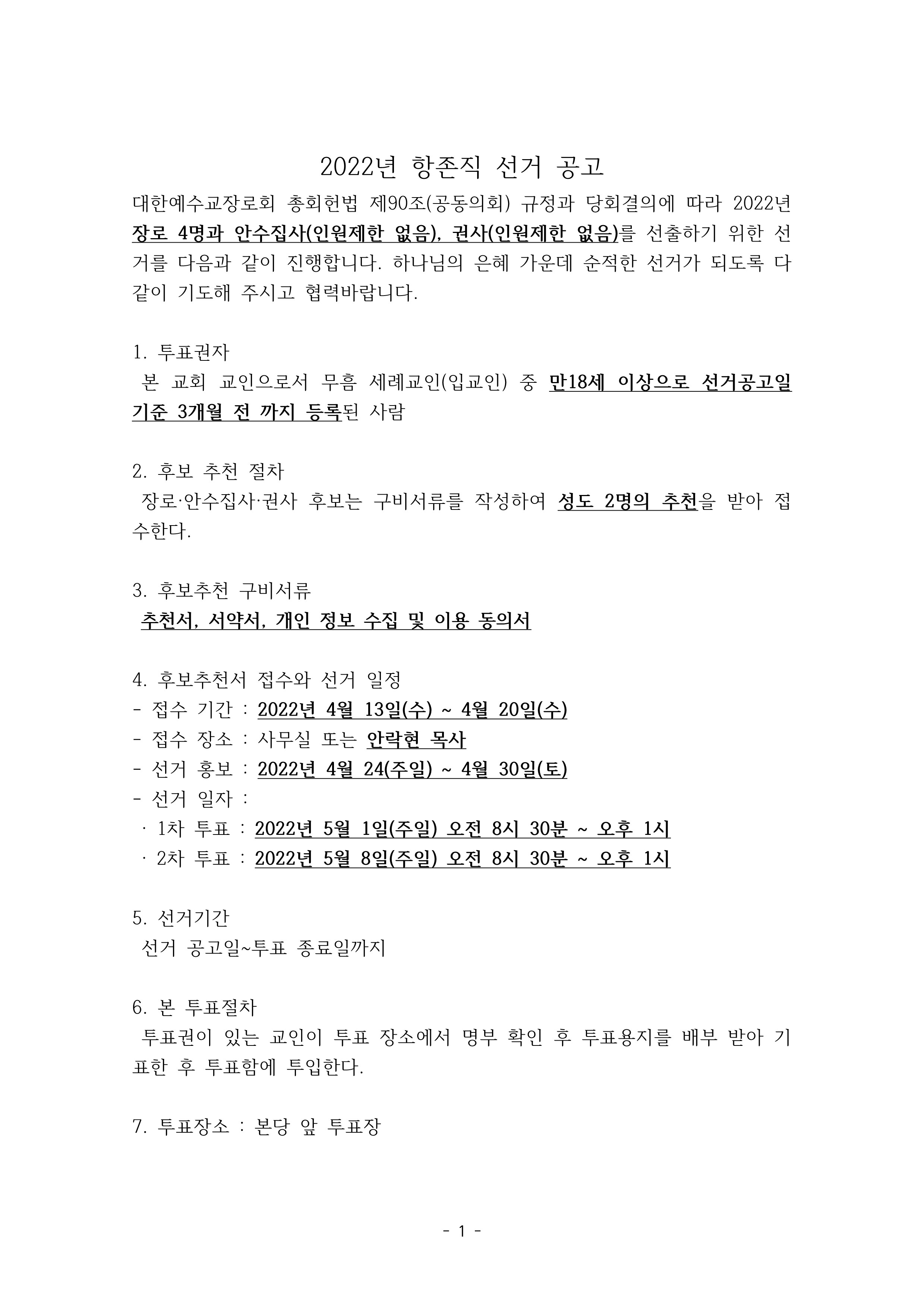 "2022년도 항존직(장로, 안수집사, 권사) 피택을 위한 선거 일정을 다음과 같이 공고합니다."